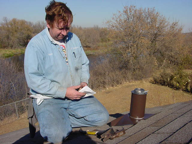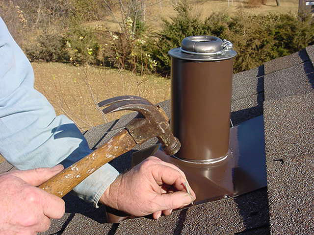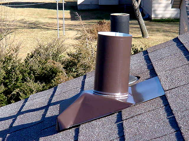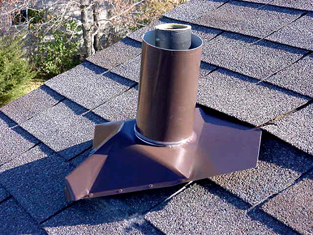 2. Place new vent pipe flange next to vent pipe and visually check pitch alignment. Vent pipe must extend 2" to 5" above base sleeve to allow for roof expansion and contraction.