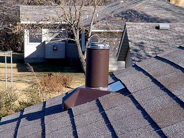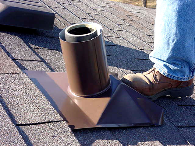 3. Place the vent flange over the vent pipe and rotate into position under one or more rows of shingles. Visually check the base sleeve centered around the vent pipe for equal air circulation.